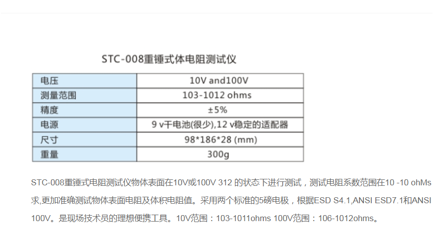 STC-008重锤式电阻测试仪对物体表面在10V或100V 3 12 的状态下进行测试,测试电阻系数范围在10 -10 ohMs,测量RTG/RTT和电阻系数用来满足ANSI/ESD S20.20测试设备需求