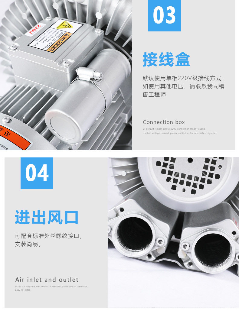 高压漩涡气泵 外观经过精心研磨,表面光滑,亮泽亮丽,给人舒适的感觉。在生产技术上采用先进的设计、制造技术,每道工序都经过严格的检测,通过CE认证,高达2500m3/h的吸气量和高达780mbar的压差,并采用宽压双频,使用零件达到更高要求,运用标IP54,F级高效马达,故障极少,达到更高标准;低噪音马达加一体式的消音设备,噪音极低。