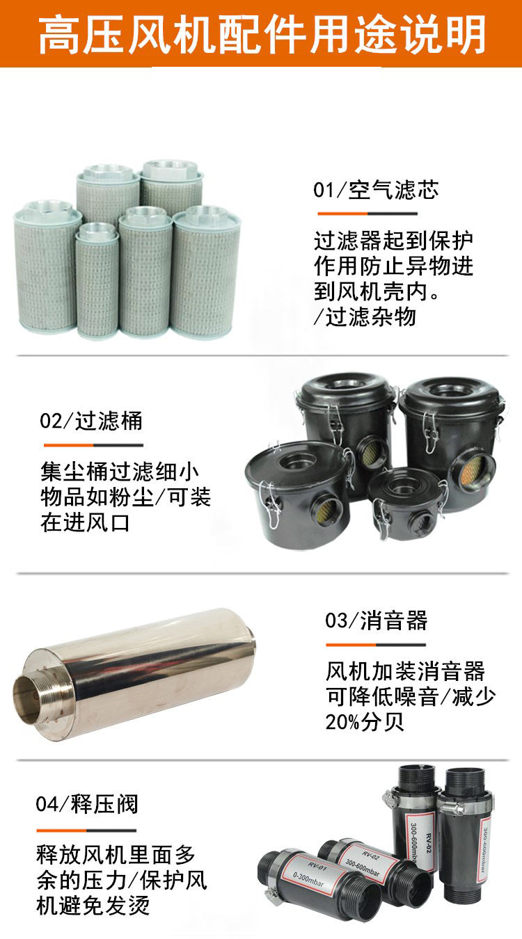 三相电压功率:0.25KW、0.4KW、0.7KW、0.85KW、1.1KW、1.3KW、1.5KW、1.6KW、2.2KW、3KW、4KW、5.5KW、7.5KW、8.5KW、11KW、12.5KW、15KW、18.5KW、20KW、25KW;单相电压功率:0.2KW、0.4KW、0.55K、 0.75KW、0.85KW、1.1KW、1.3KW、2.2KW;风压:50mbar-1010mbar;风量:40m3/h-3000m3/h,为方便选用不同规格,单段式/双段式均有提供;频率:50HZ/60HZ 电压:110V-615V,各国均可使用。如需特殊电压,可按要求定做;释压阀:RV-01 RV-02(配套使用);过滤器:MF08、MF10、MF12、MF16、MF20、MF32;消音器接口尺寸:1.25寸、1.5寸、2寸、2.5寸、4寸。
