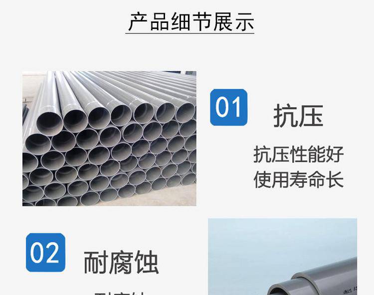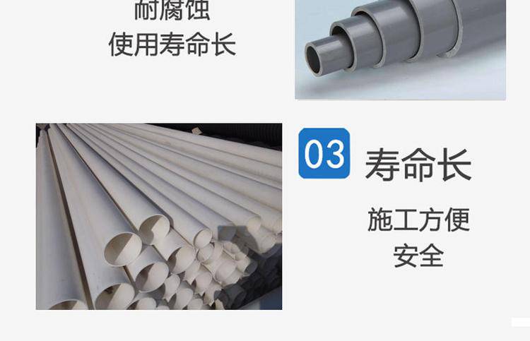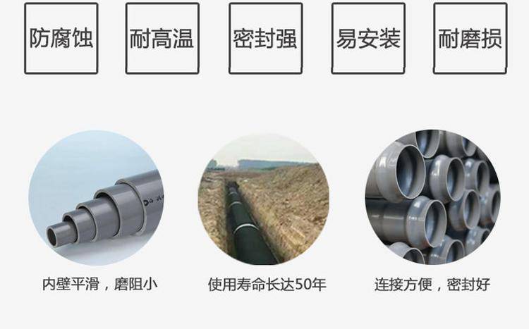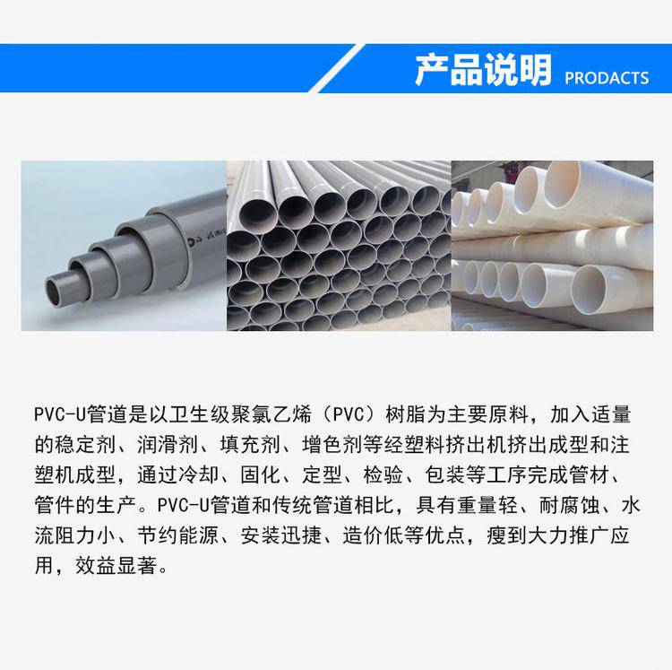 PVC塑料地埋管道 农业排碱PVC管道 矿山开采PVC爆破管 润星直发,PVC给水管是以卫生级聚树脂为主要原料,添加定量的稳定剂、润滑剂、、增色剂等,经塑料挤出机挤出成型和注塑机注塑成型,通过冷却、固化、定型、检验、包装等工序生产出的一种给水用管材。PVC给水管道所示的压力均表示为公称压力,用Mpa表示,1Mpa≈10kgf/cm2即管材在20℃条件下,输送介质的工作压力。但随着介质的温度的升高(不得输送>50℃的介质)工作压力随之减小,这从客观上在选择给水管道须考虑足够的压力的安全系数。