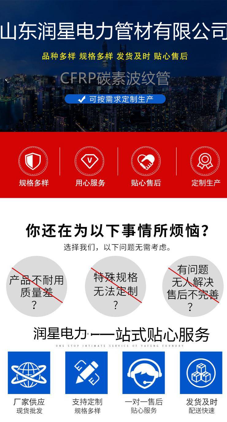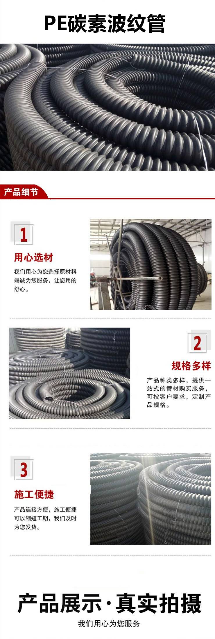 直埋穿线PE碳素管 阻燃碳素波纹管 润星电力通讯管,CFRP碳素波纹管也就是通常所说的碳素波纹管。CFRP碳素波纹管是以高密度聚和改性碳素为主要原料,碳素波纹管管采用挤出成型和独特的旋转成型工艺技术生产的新型电力线缆保护管道。它以其特有的螺纹状物造型,碳素波纹管具有高强度、高韧性耐腐蚀、耐高温、绝缘电阻高、阻燃性好、质量轻、寿命长、不易变形等多种优点,该碳素波纹管已广泛应用于城市路灯线路地埋工程,电气化铁路电力、通信电缆的敷设地埋工程,高速公路电力、通信设施的建设与改造工程,住宅小区建设工程及公园和大型场所的地埋电缆工程,是理想的地埋电缆护套管材。