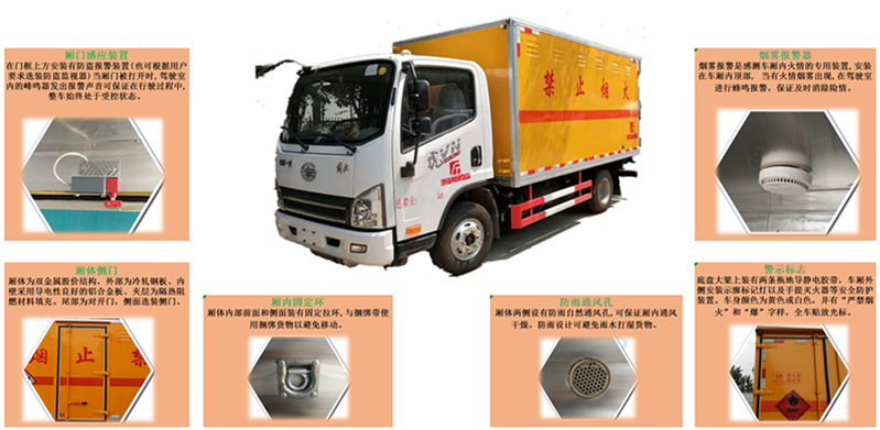 5)装置:底盘上装有两条拖地导静电胶带,厢体外侧安装示廓标记灯以及手提灭火器等装置。 车身颜色为,并有 严禁 和 爆 字样,贴有反光标识。