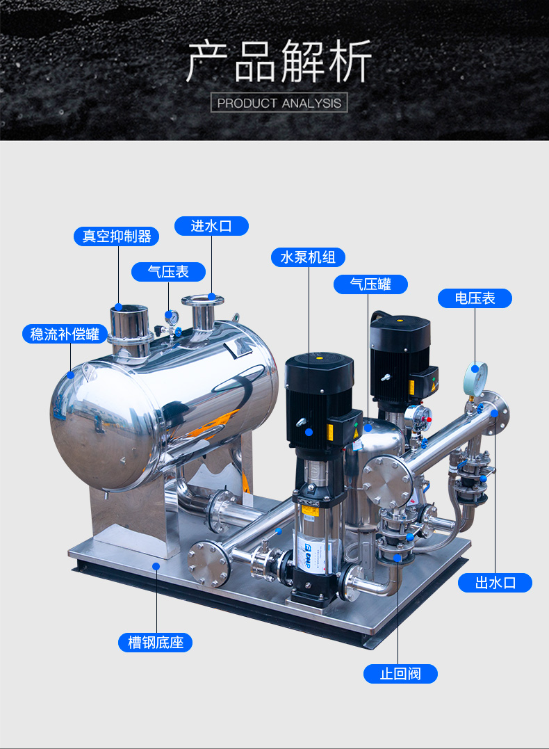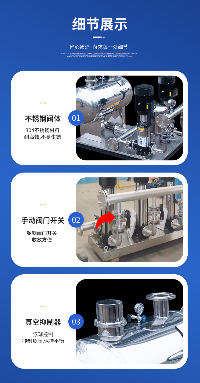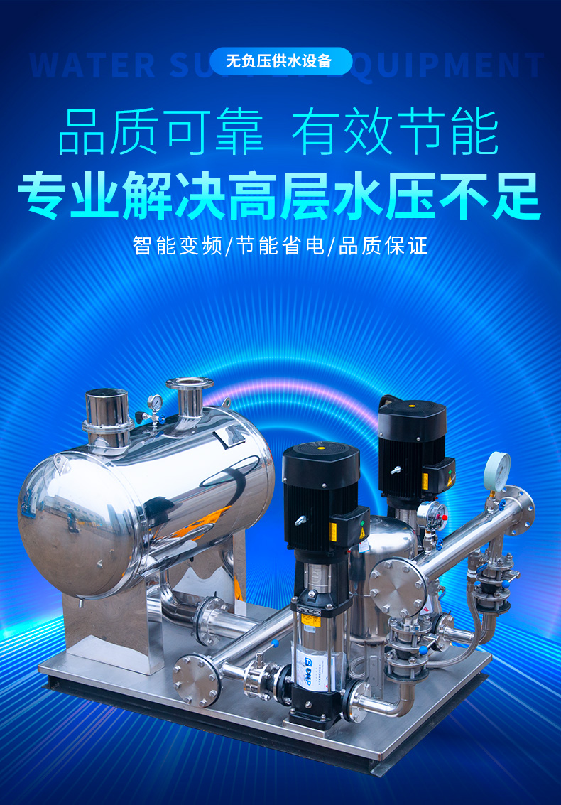 无负压设备是在管道内直接加压,安全卫生,并且调整了我们的水压,确保在一个稳定的数据中运行,对于电能损耗的减少。并且增加了原始水泵的使用寿命,可谓是恒定加压的好帮手。