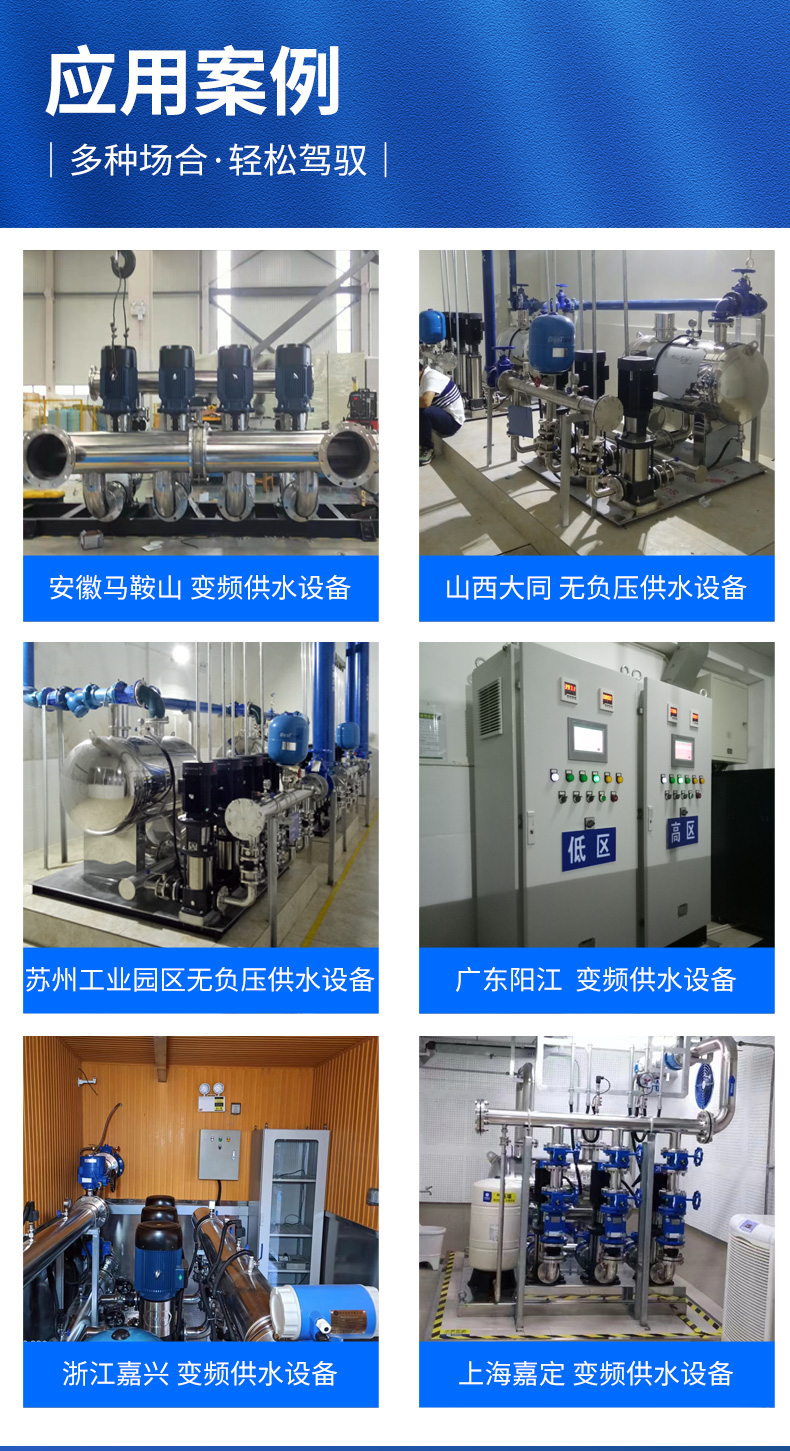 只要是市政管网进水充足的场所,都可以使用我们的无负压设备进行二次加压提升,水流量的稳定和降噪运行,对于人们的生活品质提高都是很有必要的。我们诚意推荐这个产品在符合条件的场所内部安装运行。