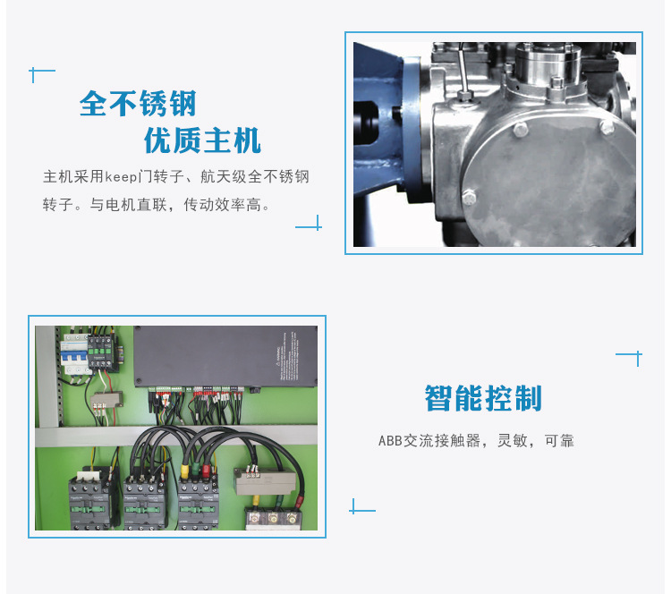 由于水润滑无油螺杆空压机是系列采用不锈钢单螺杆主机,比二级干式双螺杆节能15%以上比一级双螺杆节能36%以上;无油螺杆式空压机达到有油机的节能水准;避免干式螺杆频发、高昂的主机维修。节能:采用高容积效率的格兰克林单螺杆主机,比功率低,比双螺杆无油空气压缩机更 节能。环保:主机使用水润滑,压缩空气不受污染,同时避免废润滑油产生,符合环保要求。 静音:比喷油单螺杆式压缩机更静音,与同规格喷油单螺杆式压缩机相比,噪音要低4-5db(A) 低廉的运行及维护费用:由于不使用润滑油,无需交换废弃油、油过滤网、油分离器等,运行费用更低。