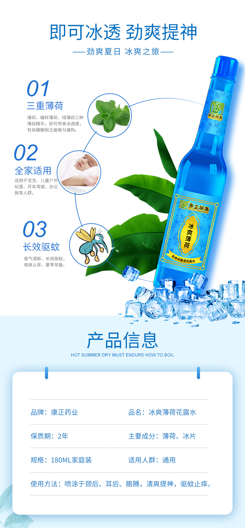 康正药业®冰爽薄荷花露水,不仅成人可以用,宝宝也可以使用。在宝宝洗澡水里倒入适量的花露水,不仅可以袪痱,还可以止痒,更重要的是洗完澡后还能有效地防蚊,宝宝也可以在浴后安心地玩耍;加上花露水的味道很清香,沐后的宝宝会散发清爽怡人的香气!袪痱防蚊,再也不怕蚊虫叮咬,带给宝宝肌肤舒爽体验!