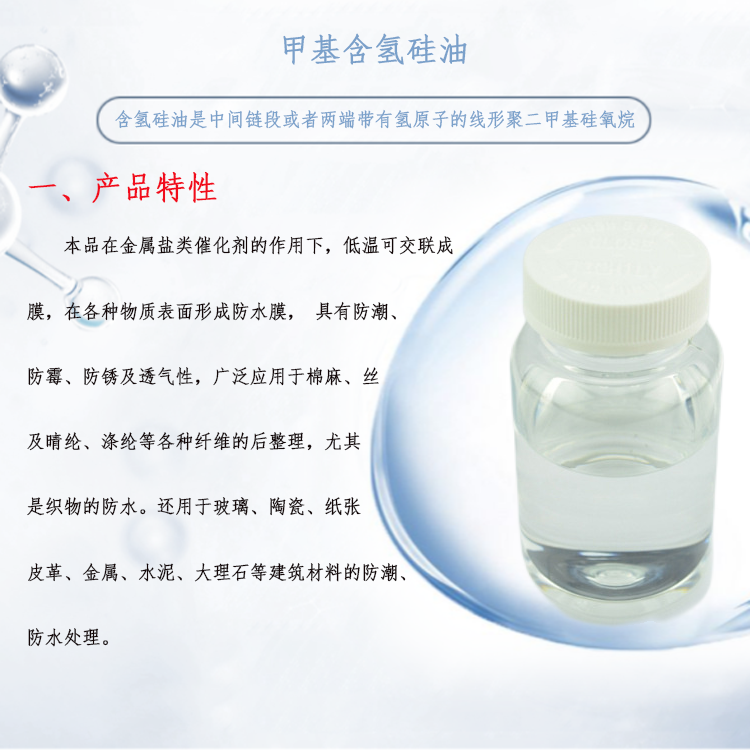 作为匀泡剂、消泡剂、水溶性硅油等产品的基本原料,用作织物、灭火剂、纸张、金属、皮革、木材、玻璃、水泥、陶瓷及大理石等的防水剂、防粘剂、防蚀剂或柔软剂,可选择不同的含氢量或不同粘度的含氢硅油进行使用。 |
