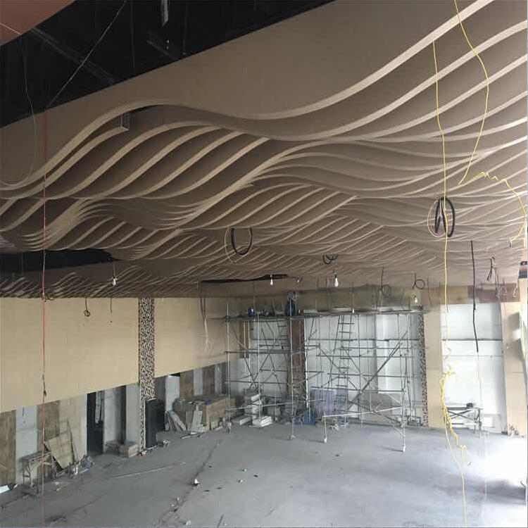 弧形铝方通吊顶以高等级铝合金为主要材料,是栓式铝方通或U型铝方通的再一步深化加工,按照特定的图纸进行深度的弧形加工,属于第三代金属铝天花铝扣板;经过切割、折弯、焊接或挤压、弯弧、酸洗络化、喷涂等生产工艺处理成型。它之所以能迷倒众多设计师,在于它的造型独特,它除了具有栓式铝方通和U型铝方通的独特而富于变化,线条明快飘逸、层次分明,通过面板高度、方向以及照明和颜色的变化。