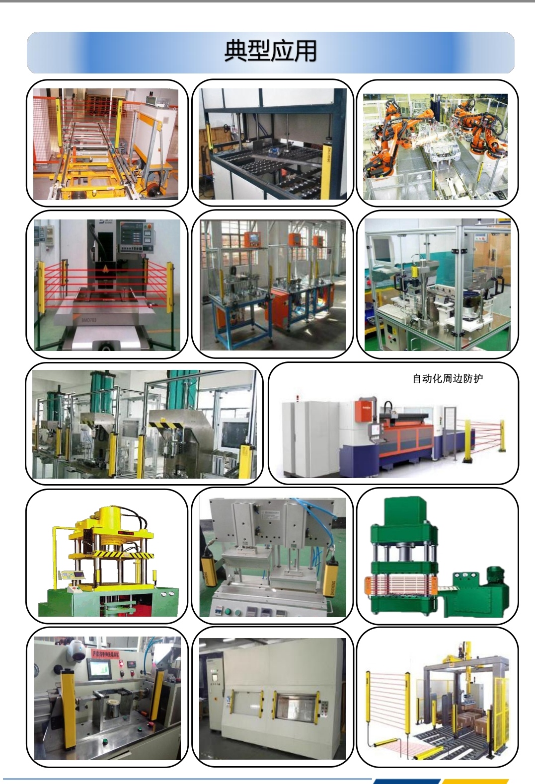 2、 联锁安全光幕保护装置:当固定保护装置不能使用或不适合使用时,可以选择与移动机构联锁的联锁保护装置。 它控制传动系统的操作机构,以确保保护装置在启动之前进入工作位置。确保操作员身体的所有部位都不会触碰到危险点。这种设备广泛用于高风险,高事故率的机械设备中。