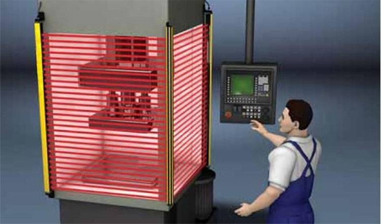 安全光栅也叫安全光幕,是一种光电安全保护装置;也称安全保护器、冲床保护器、红外线安全保护装置)是一种新开发的高品质自动控制产品,运用红外线扫描探测技术。发射装置和接收装置安装于两侧,内部由单片机和微处理器进行数字程序控制,使红外线收发单元在高速扫描状态下,形成红外线光幕警戒屏障,当人和物体进入光幕屏障区内,控制系统迅速转换输出电平信号,使负载动作从而使机器停下来,当人和物体离幕警戒区域,则负载正常自动关闭,从而达到安全保护的目的。