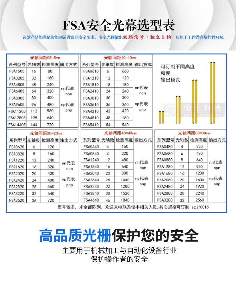 FSA系列光电保护器(光电安全保护装置)适应与机械设备配套使用。当操作者的身体某一部份进入危险区域时,FSA安全防护装置所发出的红外线光束受到遮挡,控制装置发出紧急刹车信号,使目标设备停止运行(如滑块停止动作,不能下行);当操作者从安全保护装置的光幕作用区域内退出时,红外线光束立即接通,控制装置发出接通信号,目标设备开始运行(如滑块开始运行)。
