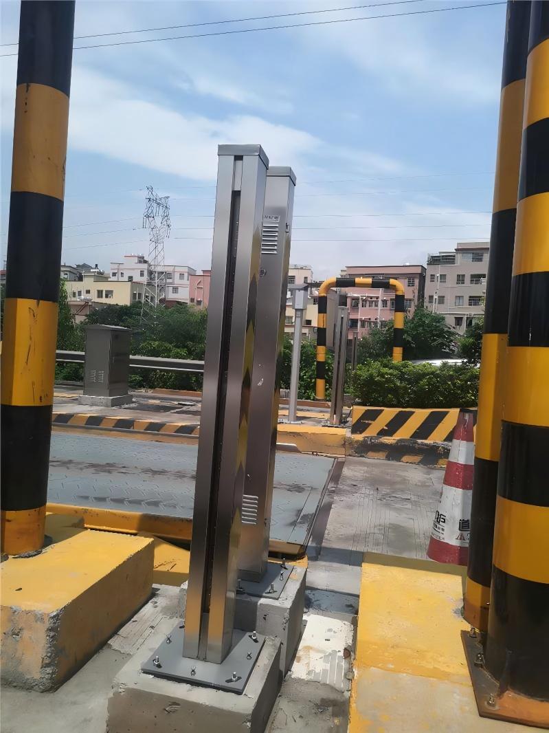 红外光栅车辆分离器的原理是通过线性排列的红外光发射和接收来实现对车辆的同步扫描,发射器内置线性排列的高能量发光元件,接收器内置与发射器数 量相同的接收元件,发射器和接收器的对应光电元件依次按 顺序同步触发,形成由多组平行的红外线光形组成的光幕, 设备检测光路是否导通, 当汽车通过扫描区域时,部分或全 部光束被遮挡, 车辆被检测出,当车辆被检测后,设备将光信号转换为电信号输出,从而实现对车辆数据的综合检测;红外光栅车辆检测分离器产品技术成熟,安装简便,高速响应,抗干扰性强,可输出丰富的车辆数据信息,能可靠检测各种特殊车辆,可消除跟车现象。地磅光幕是一种利用光学原理进行非接触式检测的装置,它主要由发射器和接收器组成。发射器将一定强度的光束投射到被检测物体上,接收器则将物体遮挡后的光束进行接收并转换为电信号。通过对电信号的处理,可以获取物体的位置、尺寸、重量等信息。地磅光
