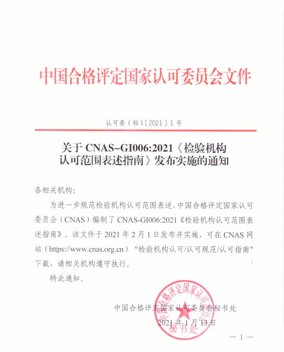 关于CNAS-GI006:2021《检验机构认可范围表述指南》发布实施的通知: