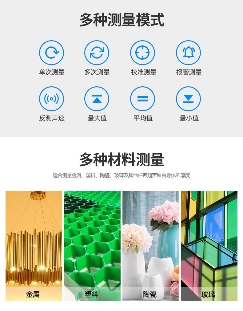 1、适合测量金属(如钢、铸铁、铝、铜等)、塑料、陶瓷、玻璃及其他任何超声波良导体的厚度;