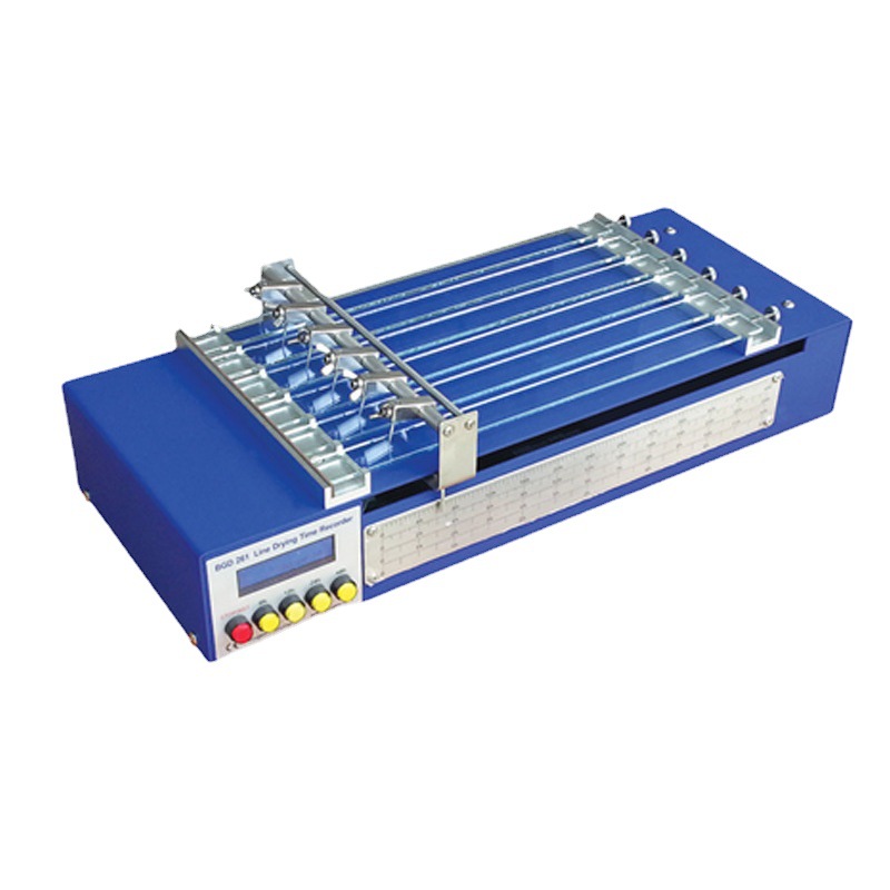 直线式干燥时间记录仪按ASTM 5895研制而成,在油漆和涂料工业中广泛使用二十年。该仪器装有一能夹持六条针(各具有球形端部)的针座,并通过一个恒速电机向针座提供动力。仪器上装有六条玻璃测试带(330*24mm);针座需要花一定的时间才能匀速走完该测试带(时间由操作者选定,有6,12,24和48小时四种),时间刻度是安装在侧板上的,其上的刻度适用于四种不同的速度(6,12,24或48小时),这些速度是通过调节仪器上的可调电机得到的。同时仪器也附带有液晶屏显示针座的运行的时间。试验结束后,操作者只需取下玻璃条对照时间刻度即可判断该样品发生在各个时间阶段的干燥特性。