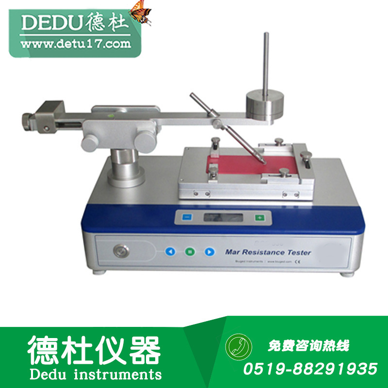 涂层耐擦伤性的测定,非常类似涂层的划痕试验,但此测试方法是用弧形(环形或圆环形)划针测定色漆、清漆或相关产品的单一涂层,或复合涂层面涂层耐擦伤性的方法:将受试产品或体系以均匀厚度施涂于具有均匀表面纹理的平整试板上。干燥/固化后,通过推动在弧形(环形或圆环形)划针下的试板来测定耐划伤性,划针被安装成以45°下压至试板表面上,连续增加作用在试板上的负荷直至涂层被划伤为止。以5次测定中至少有2次引起涂层划伤的负荷作为涂层划伤的德杜小荷。