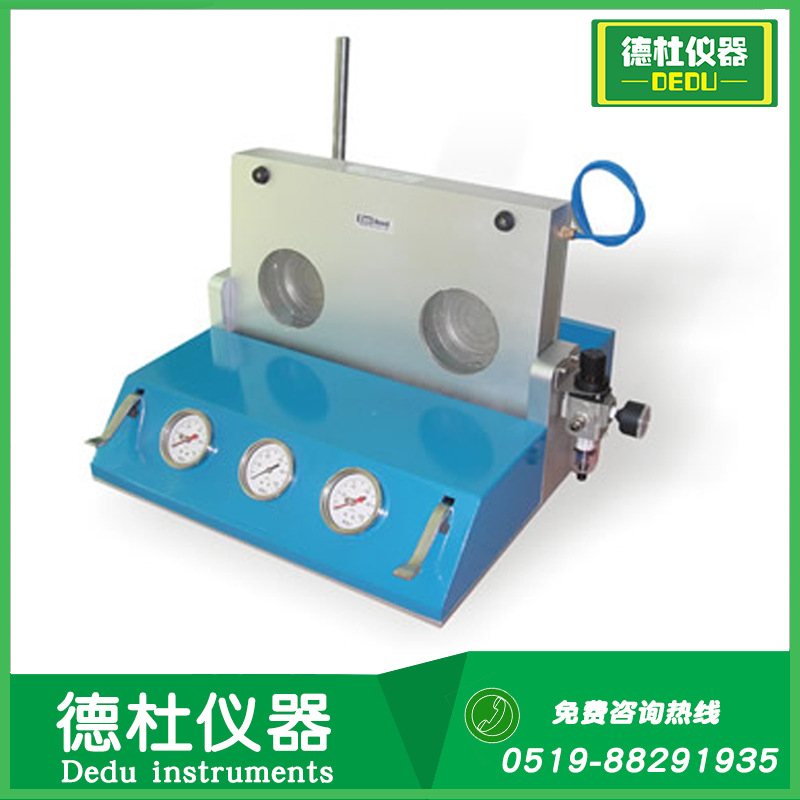ELT-100罐盖试漏仪使用方便,仪器每次检测两个罐盖,罐盖被夹具固定和密封,并被施加压力,低压情况下泄漏一般是由于拉环刻线或铆钉处缺陷引起,泄漏点通过在水浴中产生气泡而被观察到;当压力升高到某一压力值,罐盖变形开始泄漏,仪器会在面板上带有记忆指针的压力表上记录当时的压力值。