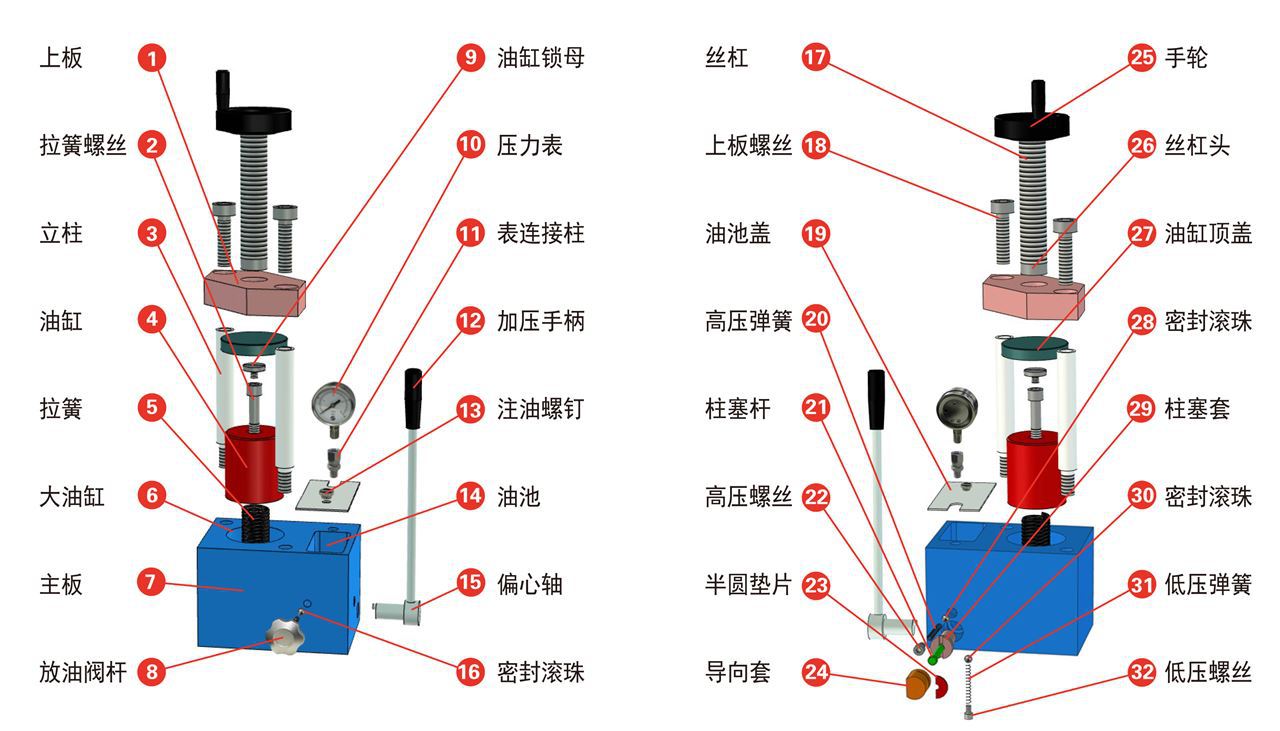 1、上板 2、拉簧螺丝 3、立柱 4、油缸 5、拉簧 6、大油缸 7、主板 8、放油阀杆 9、油缸锁母 10、压力表 11、表连接柱 12、加压手柄 13、注油螺钉 14、油池 15、偏心轴 16、密封滚珠 17、丝杠 18、上板螺丝 19、油池盖 20、高压弹簧 21、柱塞杆 22、高压螺丝 23、半圆垫片 24、导向套 25、手轮 26、丝杠头 27、油缸顶盖 28、密封滚珠 29、柱塞套 30、密封滚珠 31、低压弹簧 32、低压螺丝