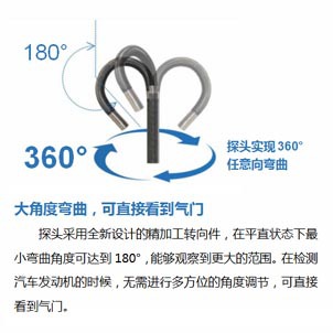 大角度弯曲探头采用全新设计的精加工转向件,在平直状态下zui小弯曲角度可达到180°,能够观察到更大的范围。在检测汽车发动机的时候,无需进行多方位的角度调节,可直接看到气门。