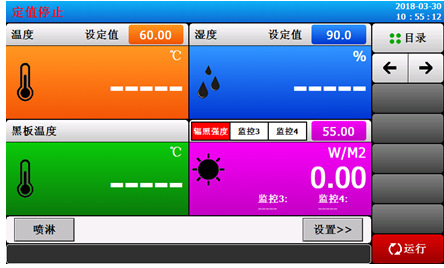 1.控制仪表采用进口7寸“日本优易"彩色触摸屏程控仪,超大画面,操作简单,程式编辑容易,带R232通讯口,设定显示箱体温度、箱体湿度、黑板温度和辐照度;