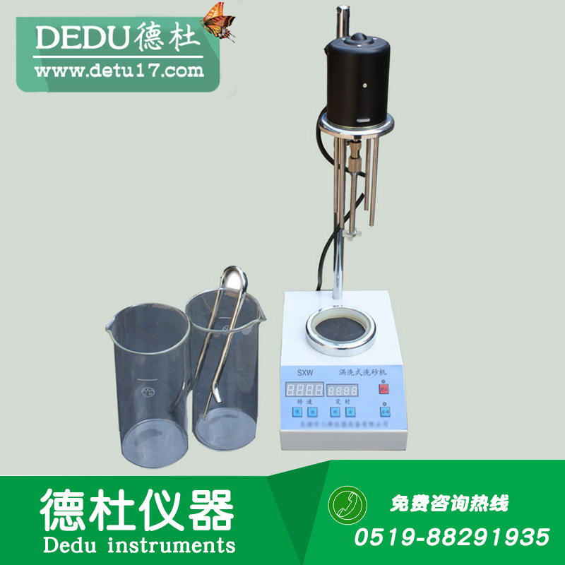 用于测定砂样中含泥量的百分率,其结构由机体、电动机、搅拌轴、阻流棒、洗砂杯和定时器等部分组成。本机特点:采用新型的搅拌叶片,是砂样中的砂不易打碎。