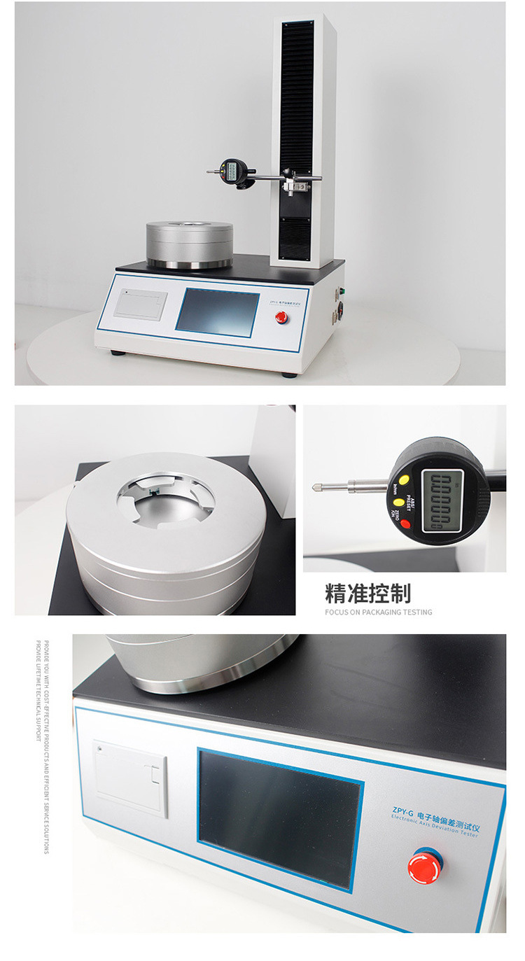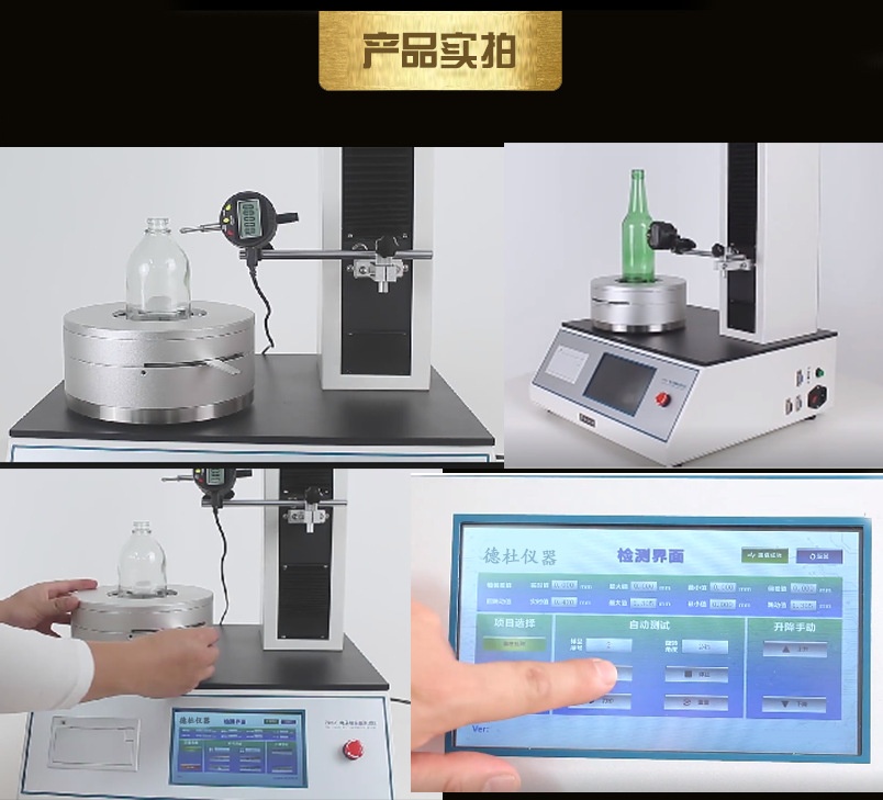 将瓶底加持固定在水平板的旋转盘上,使瓶口与千分表接触,旋转360°读取zui大值和zui小值,两者之差的1/2即为垂直轴偏差数值。仪器巧妙利用了四爪自定心卡盘同心度高的特点,配合一套可以自由调节高度和方位的高自由度的支架,可以满足各类玻璃瓶检测。