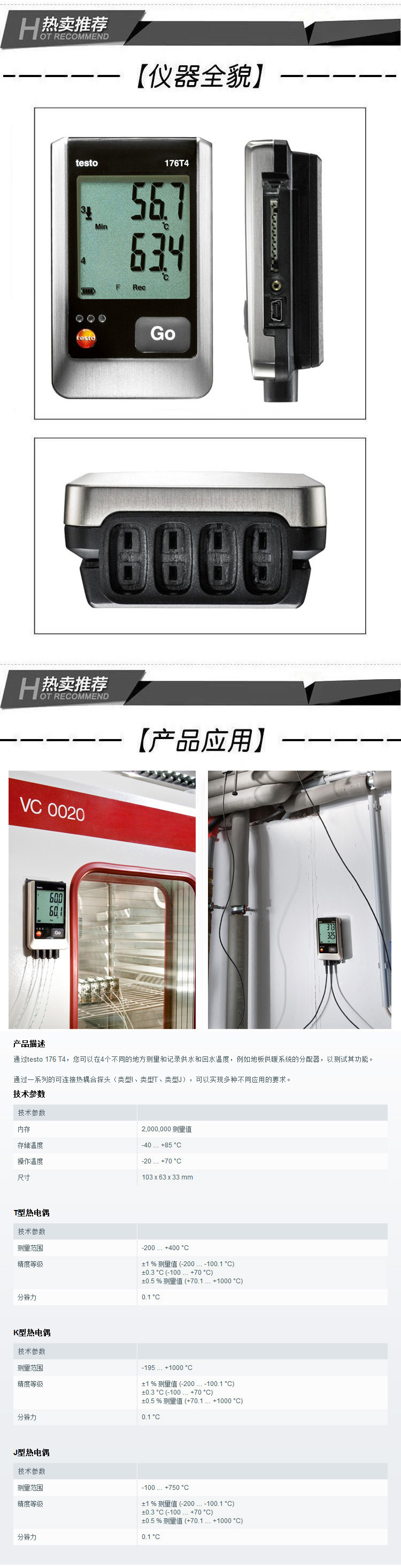 testo 176-T4 电子温度记录仪,4通道,可连接4个外置热电偶温度探头。包括扣件,扣件锁,电池和出厂报告。