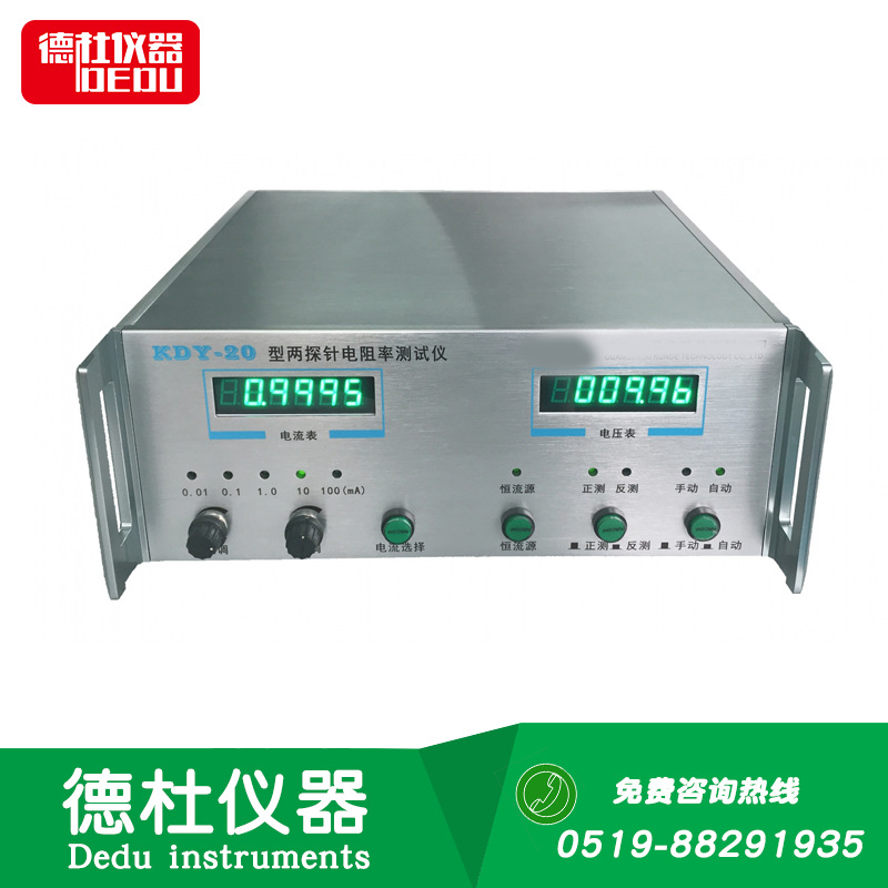 KDY-20型两探针电阻率测试仪(以下简称两探针仪)是按照我国国家标准及美国材料与试验协会(ASTM)SEMI MF397-1106(用两探针测量电阻率的测量方法)推荐的材料验收检测方法“两探针法”设计。