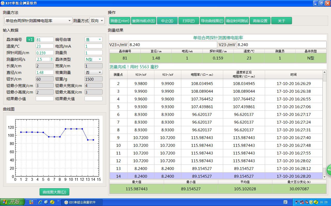 本机可配用KDY两探针测量系统,置入必须的数据后,测量软件会配合探头在硅棒上移动测量,自动计算各点的电阻率、正反向电阻率平均值、电阻率的zui大值、电阻率zui小值,zui大百分变化,测量数据实时存储在数据库中,可随时查询所有测量数据或按条件查询;