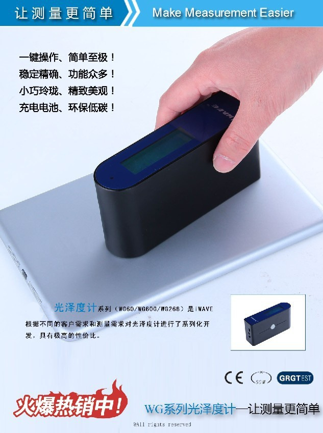 WG60光泽仪是按照guojia检定规程JJG 696标准生产的仪器,WG60G光泽度仪均采用长寿命光源,重复性好、体积小、精度高、稳定性好。WG60G光泽度仪主要适用于涂料、油墨、烤漆、涂料、木制品、大理石、花岗岩、玻化抛光砖、陶瓷砖、塑料、纸张、金属等等材料的表面镜向光泽度测量