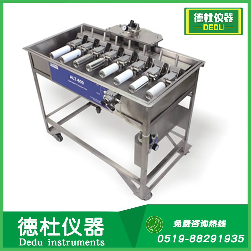 喷雾罐试漏仪(气雾罐气密性水浴试验仪)用于各类喷雾罐密封性测定,ALT-600单次可完成6个喷雾罐的测量,ALT-800单次可完成8个喷雾罐的测量。将喷雾罐放入水槽里充气加压来检测是否渗漏。如果有渗漏会观察到气泡。测量压力大约在0.8到1.0 Mpa。