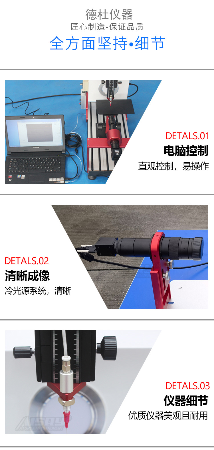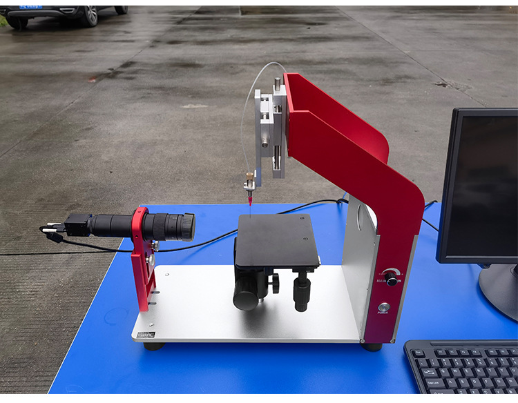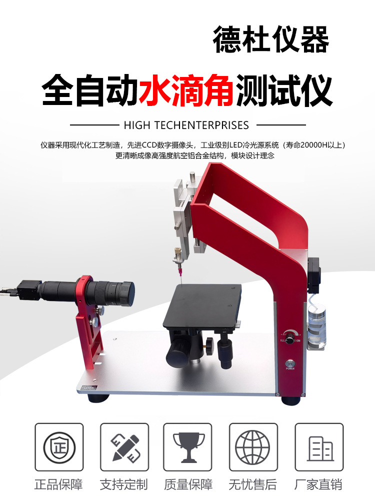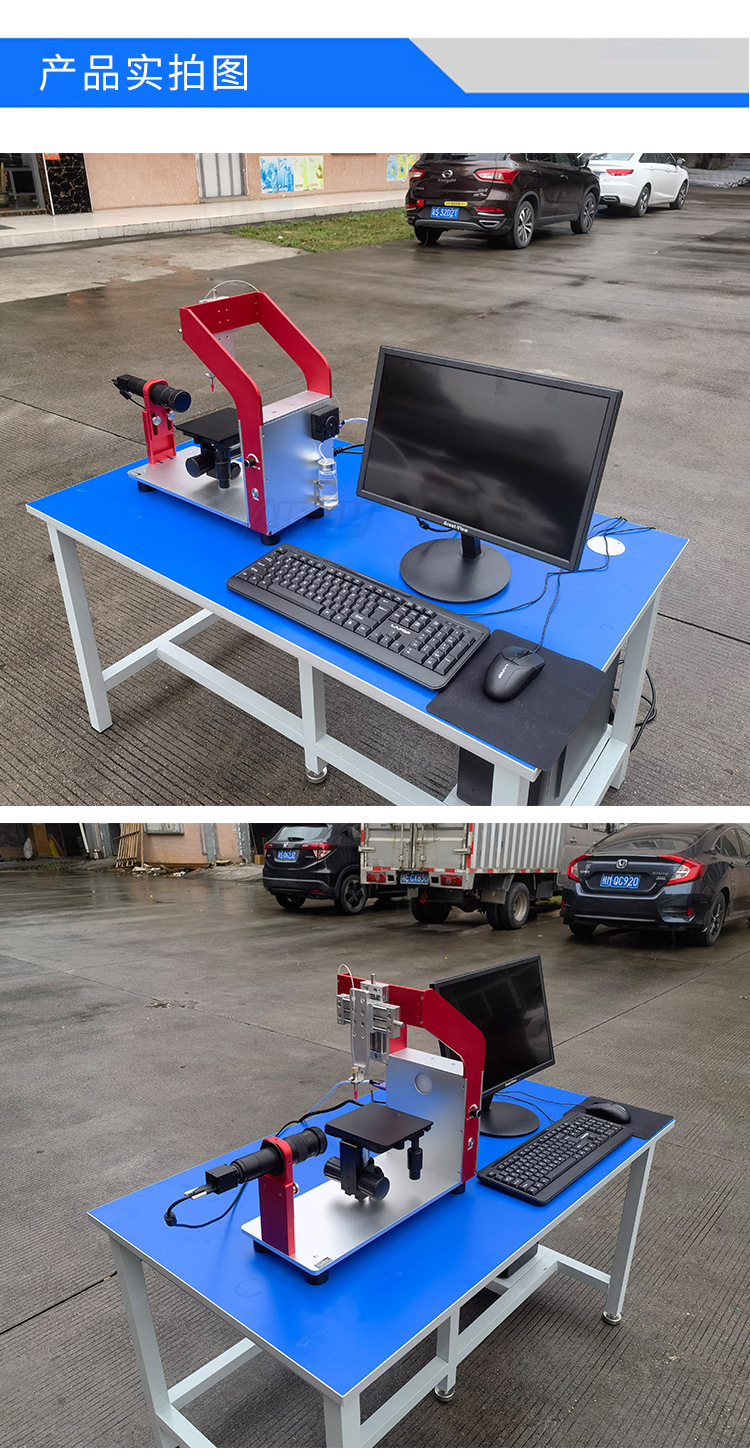 本公司仪器采用现代化工艺制造,仪器采用先进的专用CMOS数字摄像机,配倍高分辨率变焦式显微镜和高亮度LED背景光源系统,搭配三维样品台,可进行工作台上下、左右、前后等方向移动。实现微量进样及上下、左右精密移动。同时还设计了伸缩杆结构工作台,能适应在不同用户材料厚度大的场合。仪器框架可以根据式样的大小适量调节,扩大了仪器的使用范围。软件搭配修正功能,测量多次后的结果可以同时保存在同一报告下,能让用户更好的对材料数据进行管控。该仪器设计美观大方、操作简单、符合用户所需。适用于各种行业测定接触角的用户。