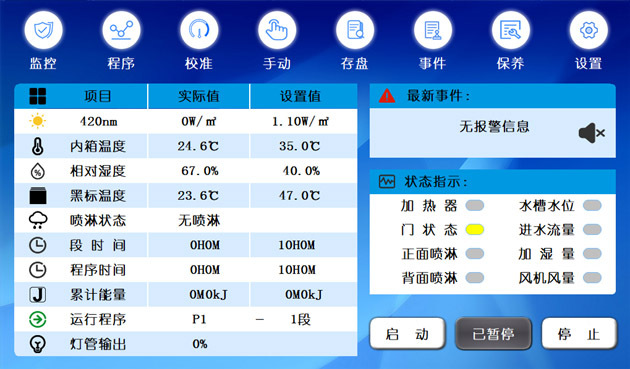 ◆ 报警保护功能:辐照度误差大,黑板或黑标超温,喷淋缺水,灯管功率异常,湿度误差大,工作室超温