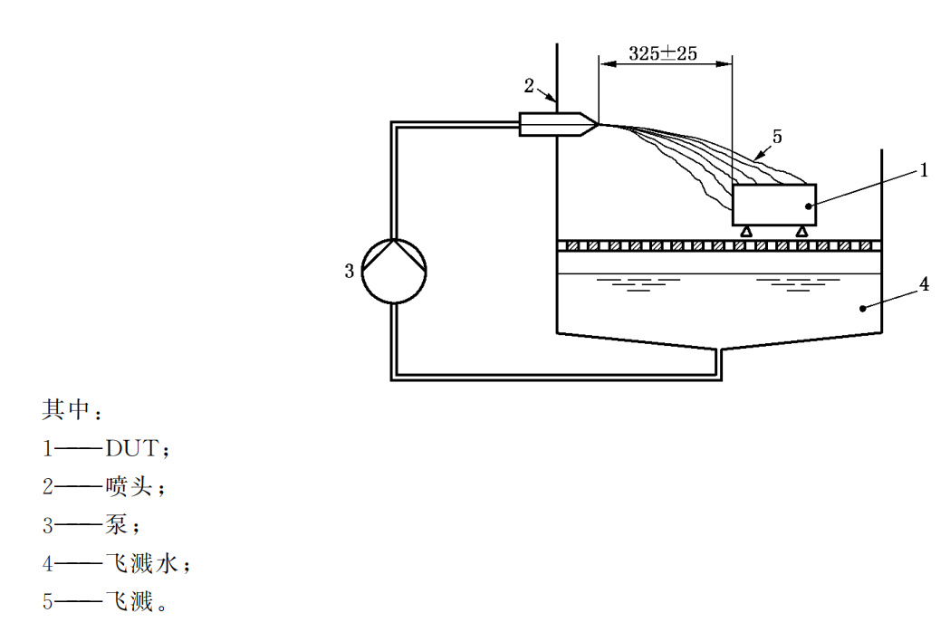 本设备按照GB/T 28046.4-2011(ISO 16750-4:2010):道路车辆 电气及电子设备的环境条件和试验 第4部分 气候负荷; 中冰水冲击试验-水飞溅试验的要求设计。
