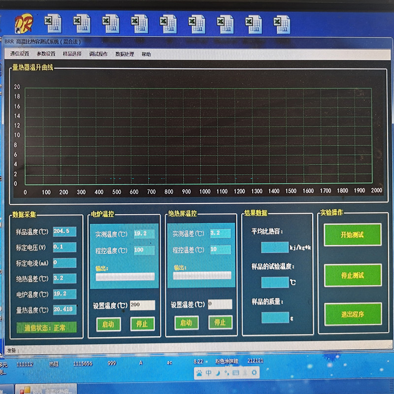 将已知质量的样品悬挂于加热电炉中进行加热,当试样的温度达到设定温度T1且稳定后,使其落入置于自动绝热环境内,初温为Tc的铜块量热计中。试样放热使量热计温度升高到末温Tn,通过测量量热计的温升,可求出试样的平均比热容。