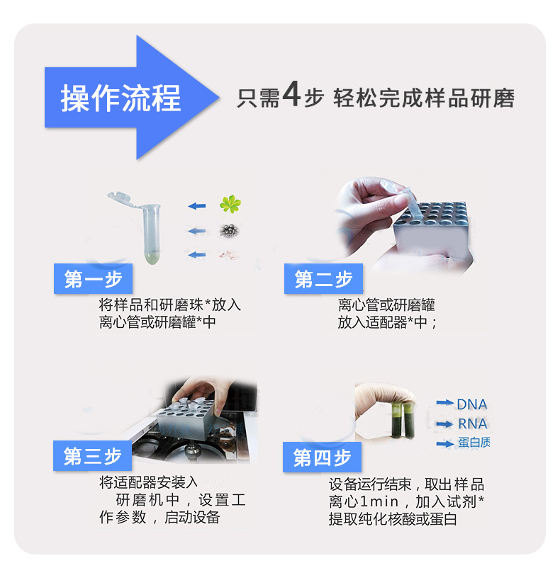 *通常用于DNA和RNA分离的少量样品可在一次性离心管中制备.可采用聚四氟乙烯材料制成的适配器,容纳5或10个一次性样品试管,进行细胞破碎.在多样品组织研磨机中细胞组织在极短的时间内得到快速而有效的破碎,因而无需额外的低温制冷。