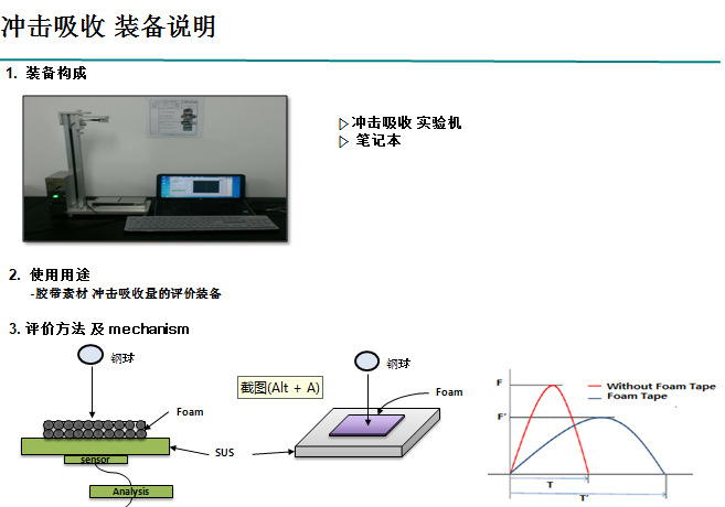 6、 能量测量:通过一定高度的平面锤头自由下落冲击试样,通过安装在锤头内部的芯片对冲击力和加速度进行分析得出数据