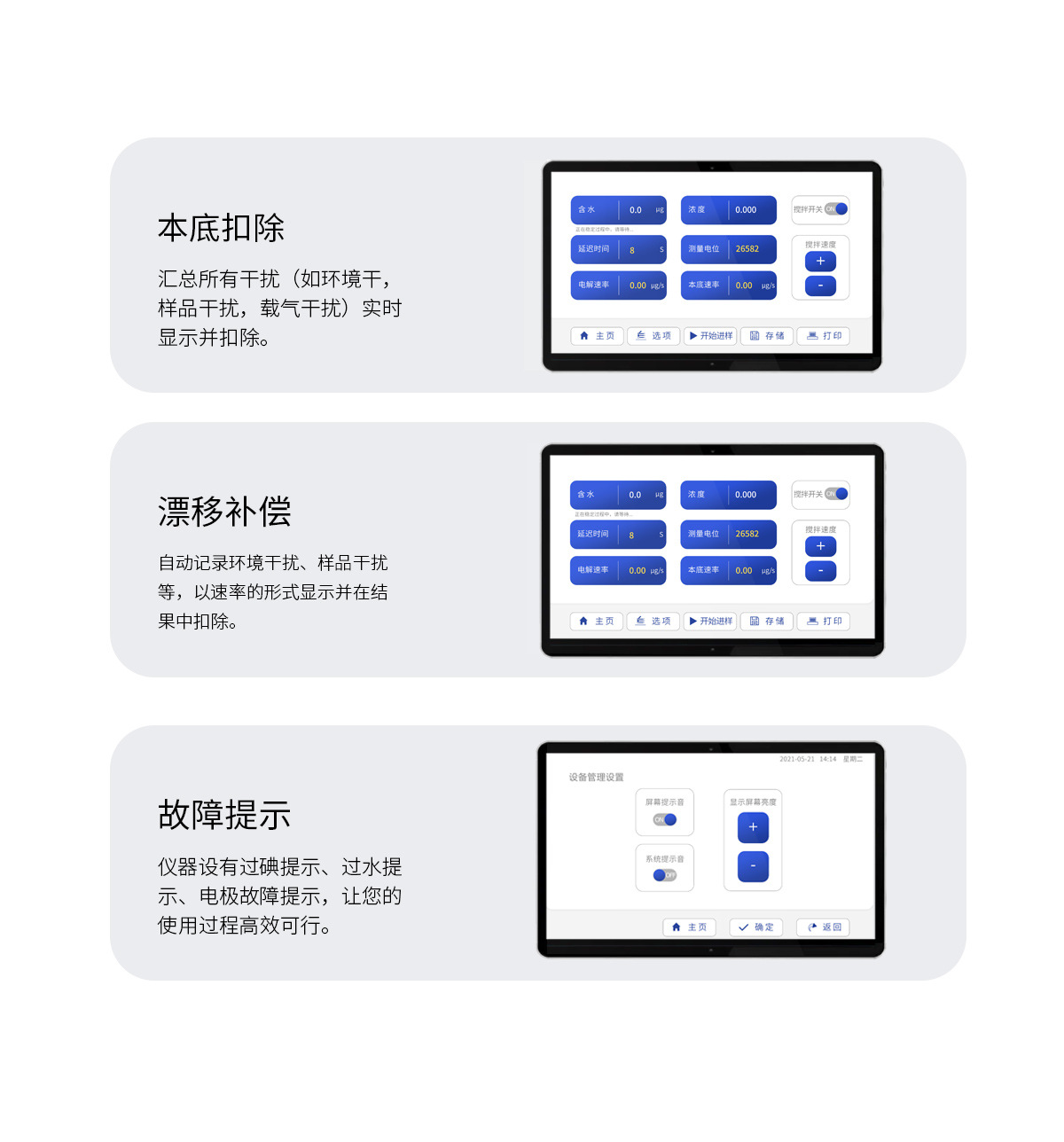 2. 中英文触摸液晶屏显示,测量电极数据直接A/D采样转换,采用先进的单片机控制,智能分析测定,适时显示仪器工作状态;