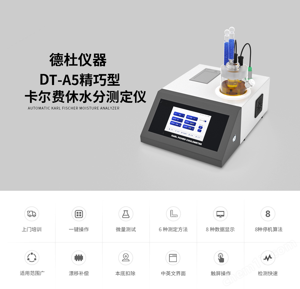 DT-A5型智能型卡尔费休水分测定仪集成了多项的先进生产技术,测定原理为测水经典方法【卡尔—费休库仑法】,测定范围低至0.0001%(1ppm),DT-A5型智能型卡尔费休水分测定仪可在60秒内快速测定出液体、固体、气体中的水分含量,广泛应用在化工、石油、电力、科研、铁路等行业。在化工、石油、电力、科研、铁路等行业。
