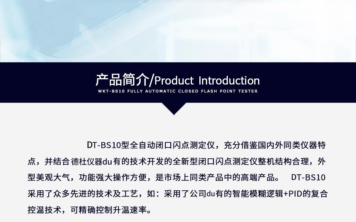 DT-BS10型全自动闭口闪点测定仪,充分借鉴国内外同类仪器特点,并结合全新型闭口闪点测定仪整机结构合理,外型美观大气,功能强大操作方便,是市场上同类产品中的you质产品。DT-BS10采用了众多先进的技术及工艺,如:采用了公司*的智能模糊逻辑+PID的复合控温技术,可jing确控制升温速率。DT-BS10型全自动闭口闪点测定仪是第四代智能型分析仪器,可广泛应用于电力、石油、化工等领域,是市场现有产品的理想换代产品。