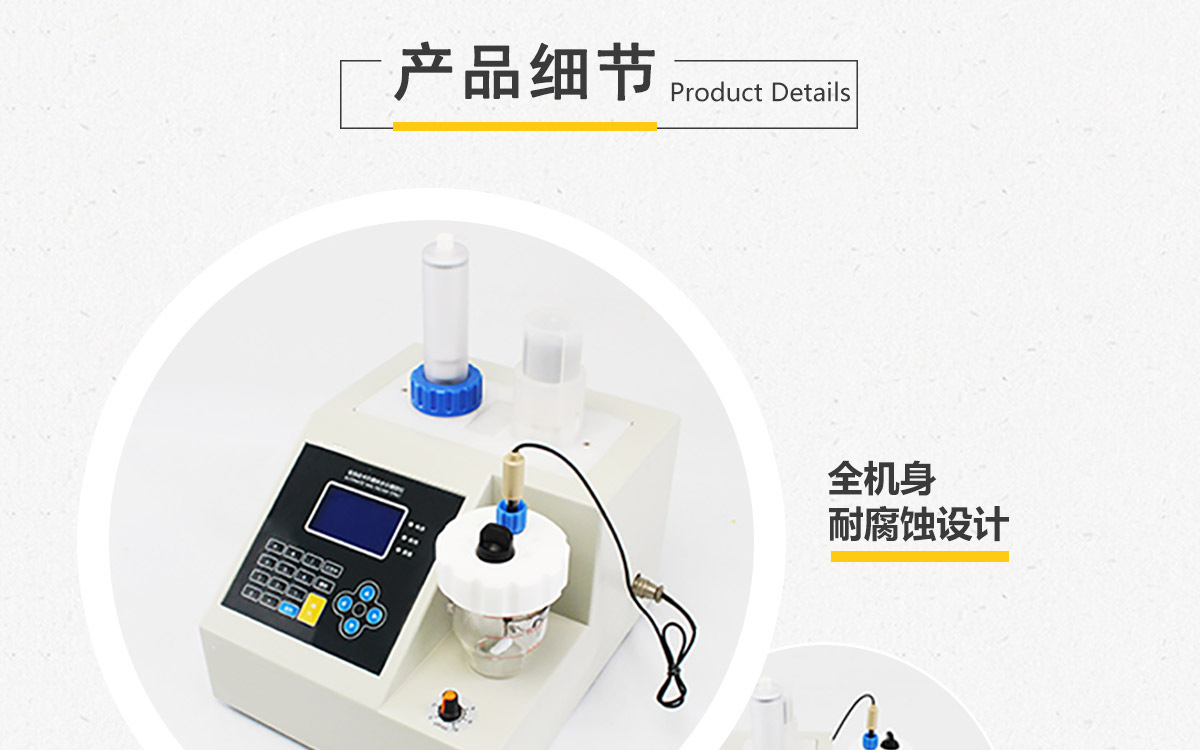 8、采用仪器滴定结构,保证了仪器滴定的准确性与稳定性,最小滴定精度为0.002mL;