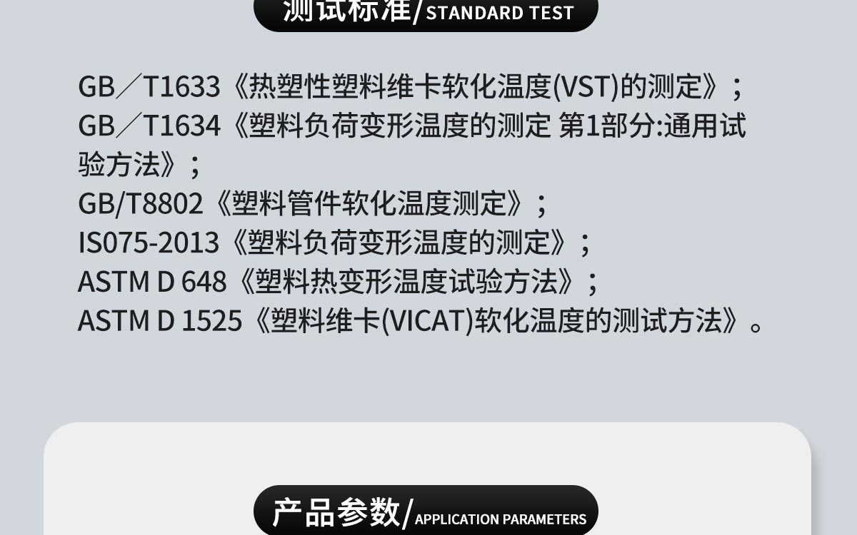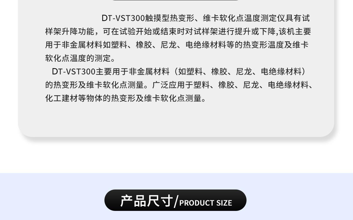 DT-VST300热变形维卡软化点温度测定仪主要用于非金属材料(如塑料、橡胶、尼龙、电绝缘材料)的热变形及维卡软化点测量。广泛应用于塑料、橡胶、尼龙、电绝缘材料、化工建材等物体的热变形及维卡软化点测量。