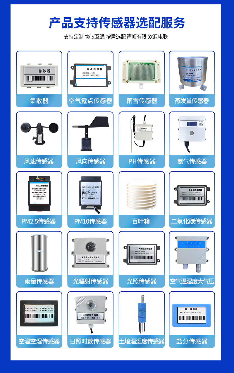 气象监测仪配备的传感器可以从1到25种任意组合,也可选配太阳能供电。