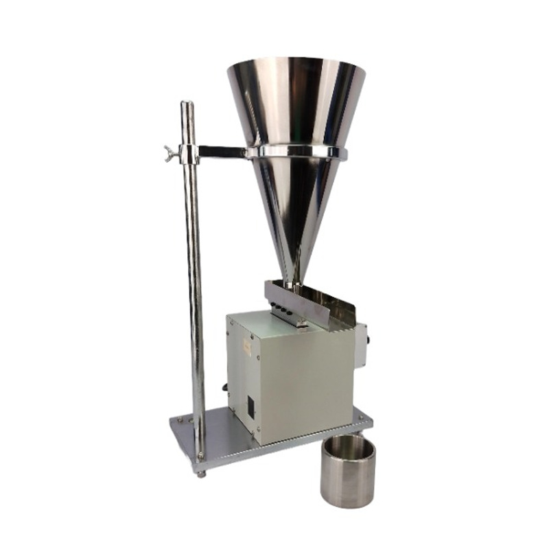 将待测的微粉装入漏斗,微粉在自身的堆积作用下处于堆积状态。当电磁振荡器启动后,微粉在电磁振动的作用下,途径流入测量桶中,将落入到测量筒中的微粉刮平,在天平上称取刮平后测量筒中的微粉质量,再除以测量筒的容积,就可以测出待测微粉的堆积密度
