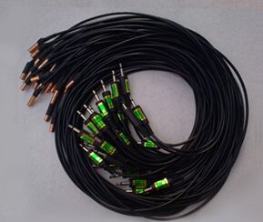 预埋式测温线由插头、导线和温度传感器制成,适宜测量混凝土内部温度,每支测温线可测一点温度,在施工中可任意布置测温点。为便于分层测温,每支测温线的插头都贴有相应长度规格的标签。