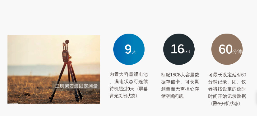 仪器内置锂电池,满电可连续使用超过96小时,仪器背部有标准1/4英寸三脚架接口,可连接三角架进行测量。