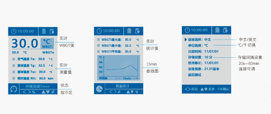 JT2022是一款手持式便携WBGT指数仪,专yi的工业设计结构外观,保证了产品总体的高品质。传感器均可独立拆卸,使用50mm直径铜质黑球,进一步提升仪器的整体便携性能,传感器连接使用航空接头,坚固稳定,不易晃动,仪器屏幕使用带有背光的LED显示器,人性化界面,易读取,可显示WBGTin、WBGTout值、Ta、Tg、Tnw、RH,以及WBGT测量曲线。