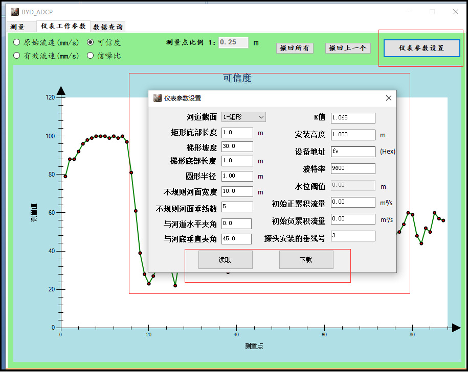 提供河道断面形状选择,参数设置,数据查询,显示测量点,原始数据,可信度,信噪比,有效数据,上传时间,曲线数据