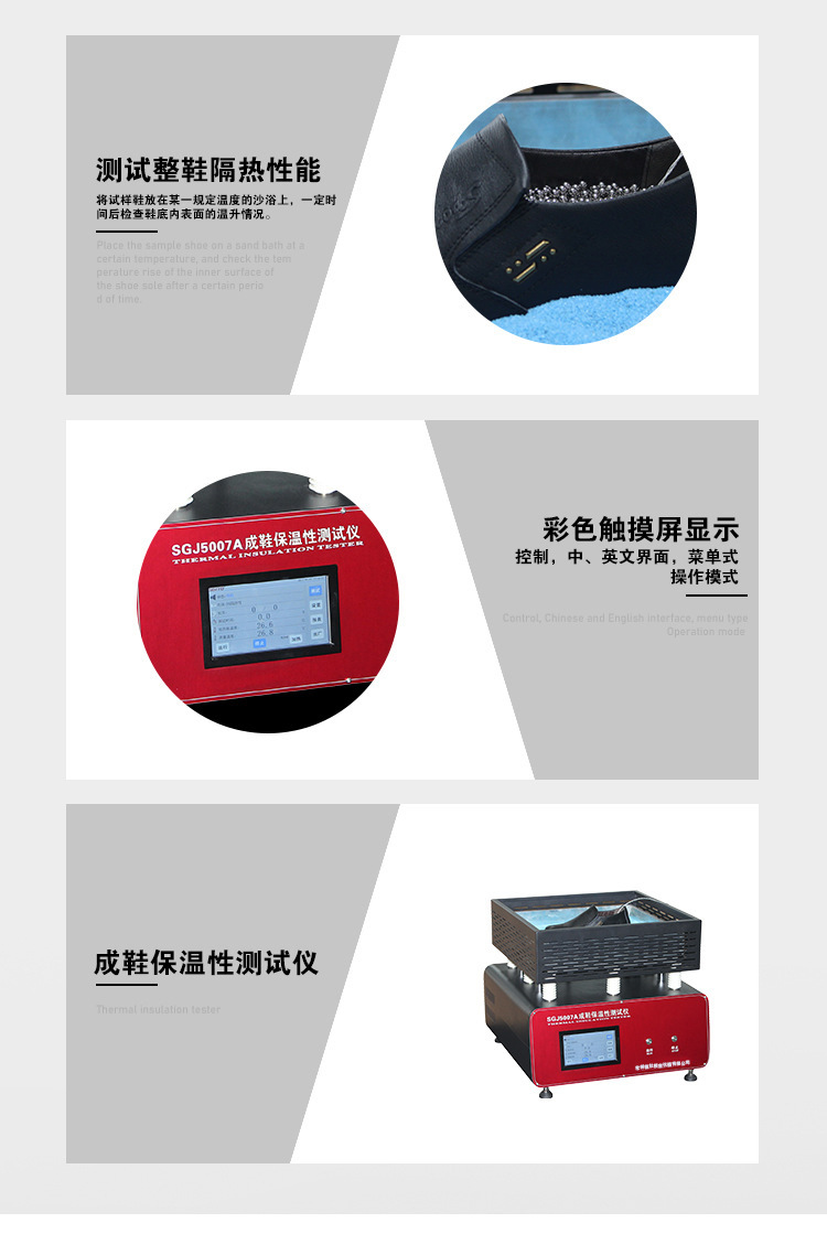 用于测试整鞋的隔热性能,将试样鞋放在某一规定温度的沙浴上,一定时间后检查鞋底内表面的温升情况。