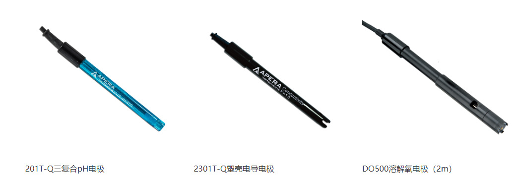 标配 201T-Q 三复合 pH 电极,锂玻璃敏感膜,响应快、低漂移,内置温度传感器。